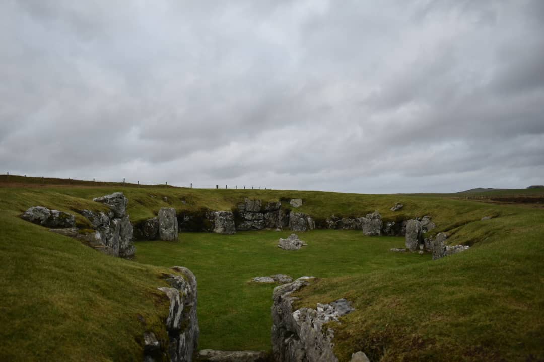 Stanydale Temple in Shetland is a unique, large Neolithic stone structure (c. 2500-2000 BC) with a mysterious purpose, possibly a communal hall, chieftain's house, or ritual site, known for its distinctive heel-shaped facade and thick walls, built by early farmers and used intermittently into the Iron Age, offering rare insights into prehistoric life before being buried by peat and rediscovered in modern times.